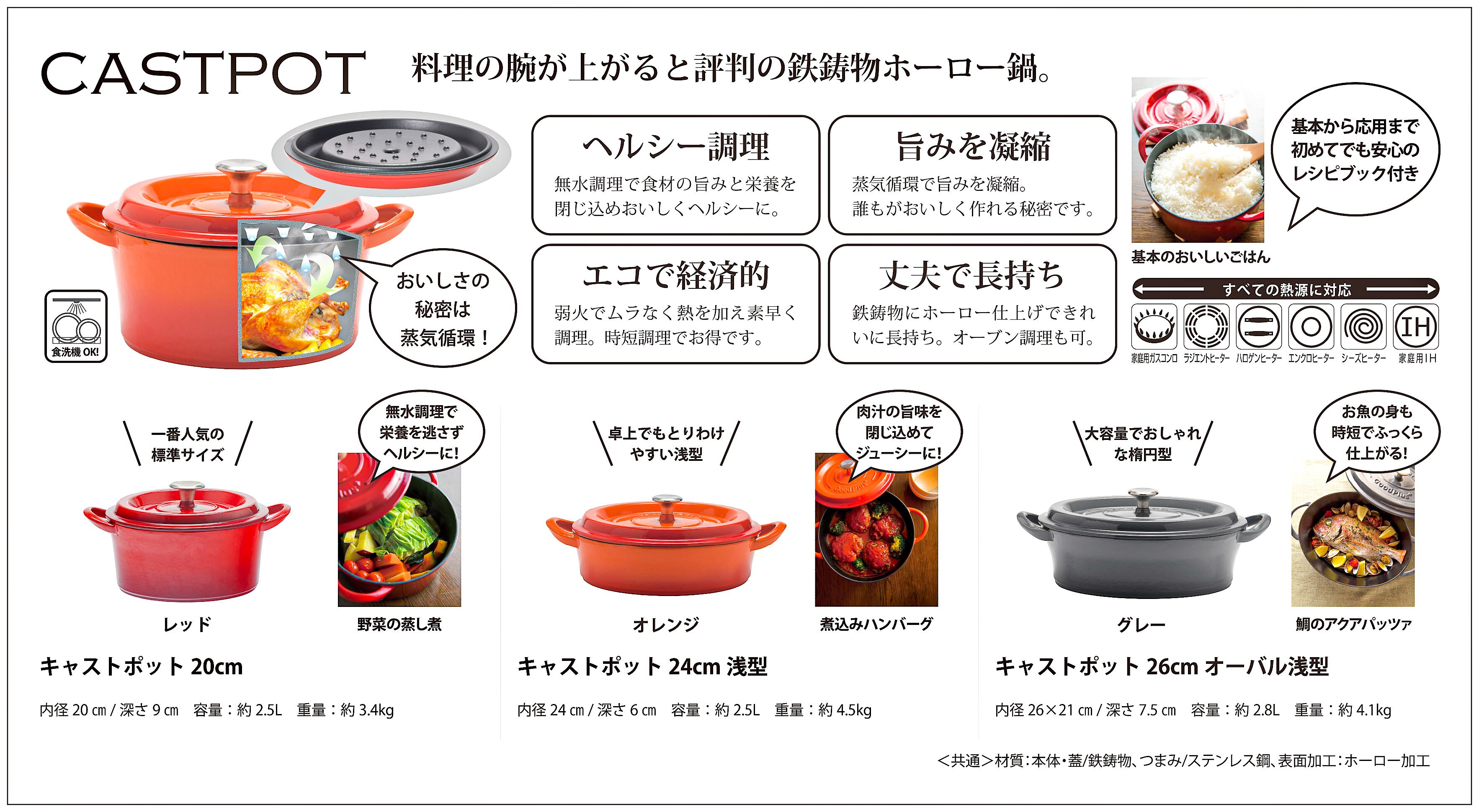 ●【希望小売価格:15,400円(税込)】●JANコード:4549092000025 、●サイズ:内径:18cm 、深さ:8cm 、●容量:約1.8L 、●重さ:約2.8㎏ 、●【材質】本体:鉄鋳物ホーロー、ツマミ:ステンレス鋼、●生産国:中国、※「キャストポット」は、株式会社グッドフェイスが企画・設計及び監修し、日本基準の厳重な品質管理の下で中国工場で製造しています。