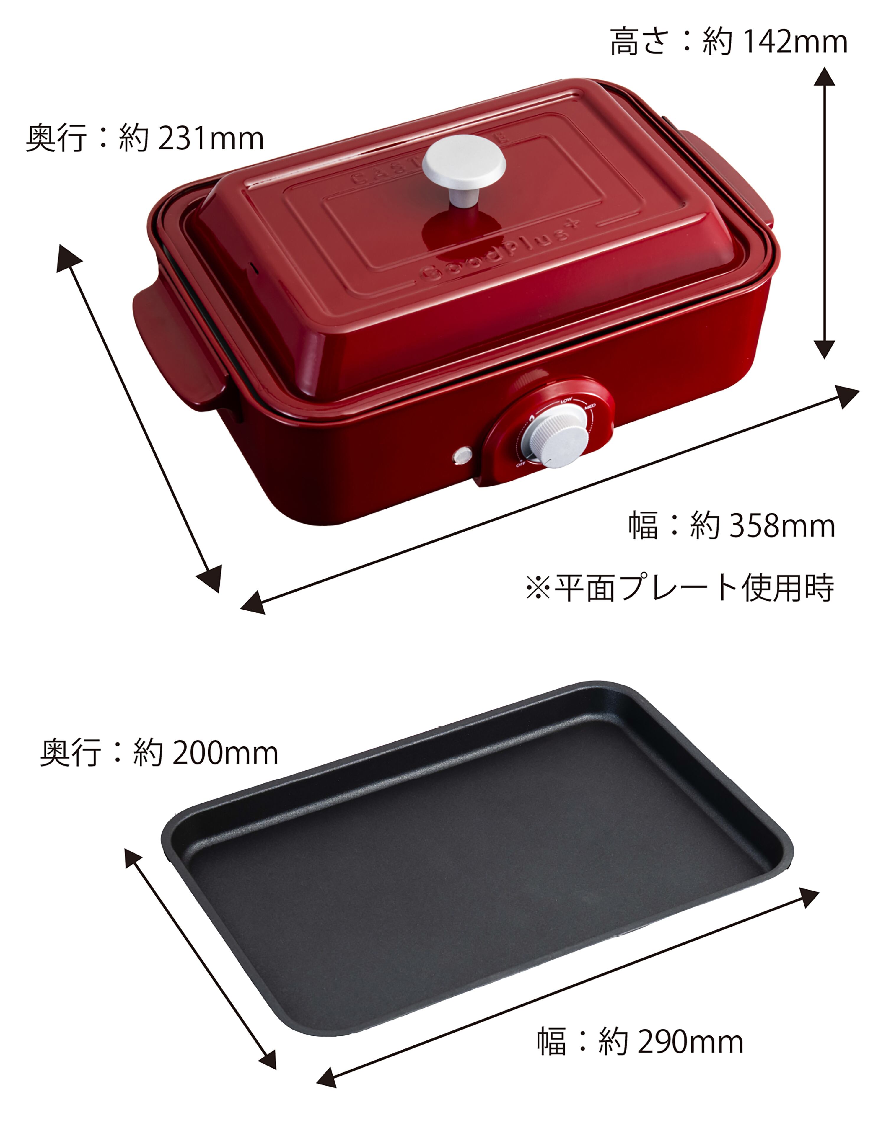 JANコード:4549092002968、 ■AC100V(50/60Hz)1200W ■電源コード長:1.4m ■温度調節:保温~約250℃、寸法:平面プレート使用時:幅358×高142×奥231mm ■素材:本体/スチール、フェノール樹脂、プレート/アルミニウム合金(内面フッ素樹脂塗膜加工) ■基本付属品:平面プレート、たこ焼きプレート、木製ヘラ、オリジナルレシピ■【1年間保証】